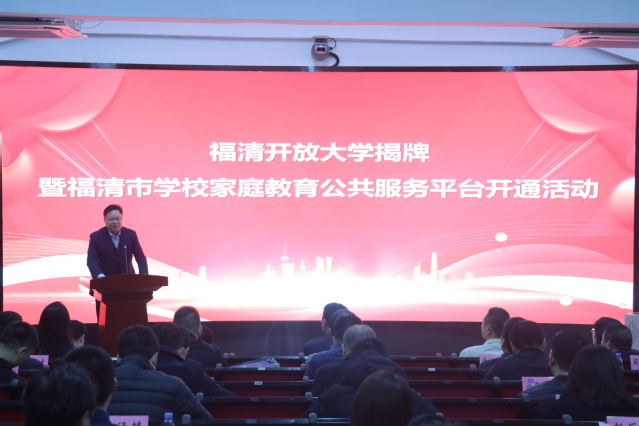 12月4日,福清开放大学揭牌暨福清市学校家庭教育公共服务平台开通活动在福清市教师进修学校举办。福建开放大学校长吴国荣,我校校长陈念东,福清市市长吴永忠、副市长郑云、教育局局长王豪杰等为福清开放大学揭牌,并启动福清市学校家庭教育公共服务平台。