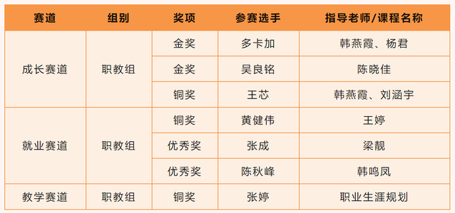 近日,第十六届福建省大学生职业规划大赛省级决赛落下帷幕。我校师生喜获成长赛道职教组金奖2项、铜奖1项,就业赛道职教组铜奖1项、优秀奖2项;教学赛道职教组铜奖1项;韩燕霞、杨君、陈晓佳3位老师获优秀指导教师奖,学校荣获优秀组织奖。