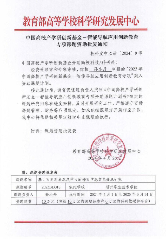 近日,教育部高等学校科学研究发展中心发布了关于“2023年中国高校产学研创新基金——智能导航应用创新教育专项”课题资助的通知。我校信息工程学院孙小丹老师主持申报的《基于面向对象深度学习的梯田信息智能提取研究》获立项,并获10万元课题经费资助。