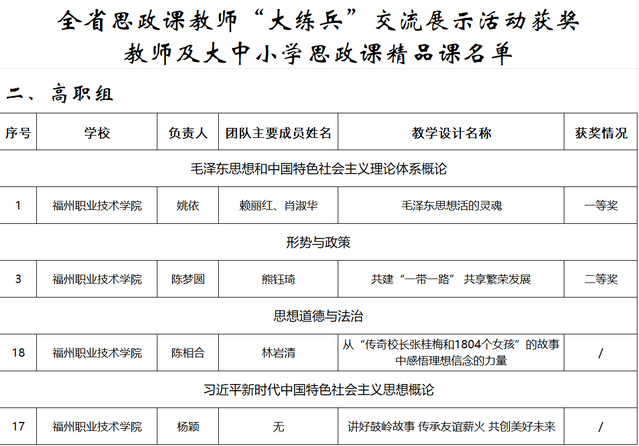 近日,《福建省教育厅关于公布全省思政课教师“大练兵”交流展示活动评选结果的通知》(闽教思〔2024〕26号)文件公布,本次比赛经学校推荐、专家评审、现场展示、网络公示等环节,我校报送的4项大中小学思政课精品课全部立项,其中姚依老师荣获《毛泽东思想和中国特色社会主义理论体系概论》高职组一等奖,陈梦圆老师荣获《形势与政策》高职组二等奖。