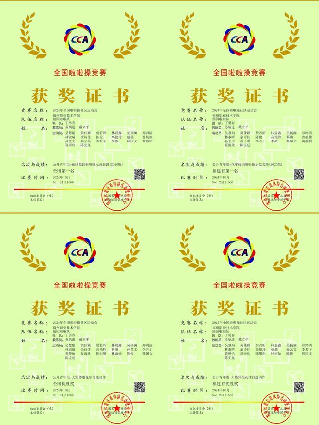2024年10月,由国家体育总局体操运动管理中心、中国蹦床与技巧协会主办的2024年全国啦啦操社区运动会顺利举行。此次比赛采用线上的方式进行,共有3800多个单位,七万多人次参加。我校励园啦啦操队(领队:丁勇春,教练员:苏炳进、戴立平)凭借精湛的技艺与默契的配合,荣获公开青年组——花球校园啦啦操示范套路(2020版)全国第一名、福建省第一名;公开青年组——大集体组花球自选动作全国优胜奖、福建省优胜奖。其中,花球校园啦啦操示范套路(2020版)项目中,我校啦啦操队与全国本科院校、高职院校的90支队伍同组竞技,以总分549的优异成绩,摘得桂冠。