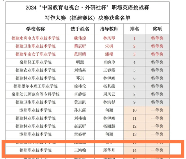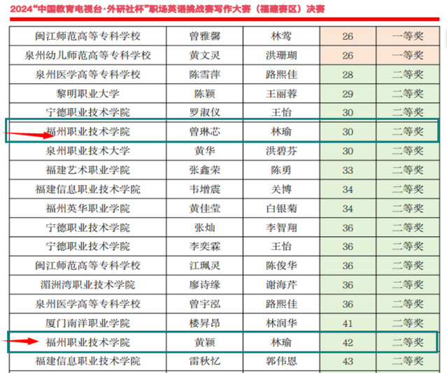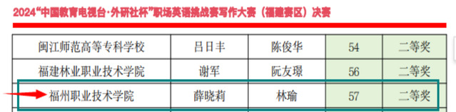 近日,“中国教育电视台·外研社杯”职场英语挑战赛写作大赛福建赛区决赛于福建船政交通职业学院举办,共有来自38所职业院校的183名选手参加。学校职业外语教研室邱华月老师指导的学生王鸿翰荣获一等奖,林瑜老师指导的曾琳芯、黄颖、薛晓莉均荣获二等奖。