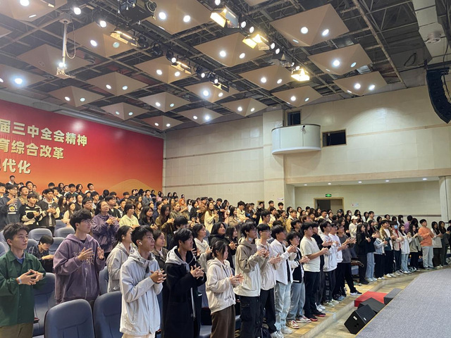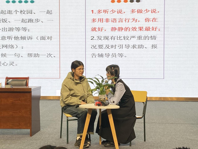 培训会上,杨老师结合真实心理案例,详细解析班级学生心理干部工作职责、心理问题识别、朋辈心理帮扶技术、危机干预工作等方面工作。通过展示优秀学生朋辈范例,鼓励学生心理干部在日常生活中探寻生活的美好,积极关照自己,并践行学生干部职责,当好宣传员、观察员、活动员、陪伴员、报告者、协助者,帮助他人,疗愈自己。实操环节,她现场邀请学生进行“一对一”朋辈心理帮扶演练,让学生心理干部印象深刻,加深了对帮扶技巧的具象理解。培训最后,杨老师还介绍了常用的心理调节方法和具有中医药特色的解压放松手操,全场学生热情高涨,互动踊跃。