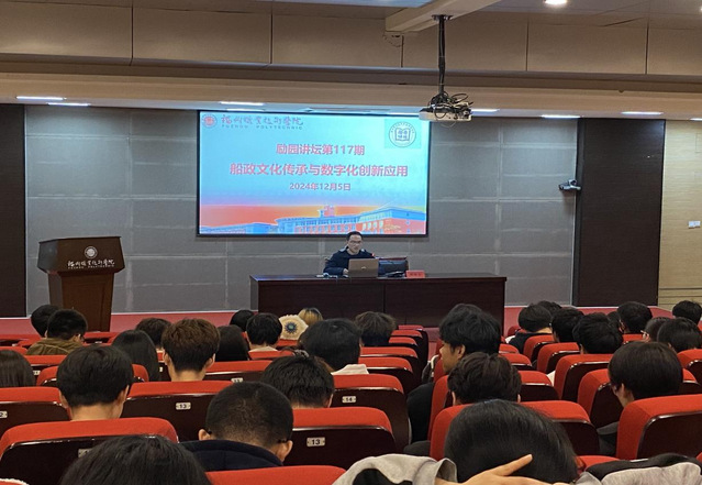 12月5日,由机电工程学院承办的第117期励园讲坛“船政文化传承与数字化创新应用”在学术报告厅成功举办,本次讲坛由我校省级个人科技特派员、车工高级技师陈向文老师主讲,各二级学院学生代表参加。