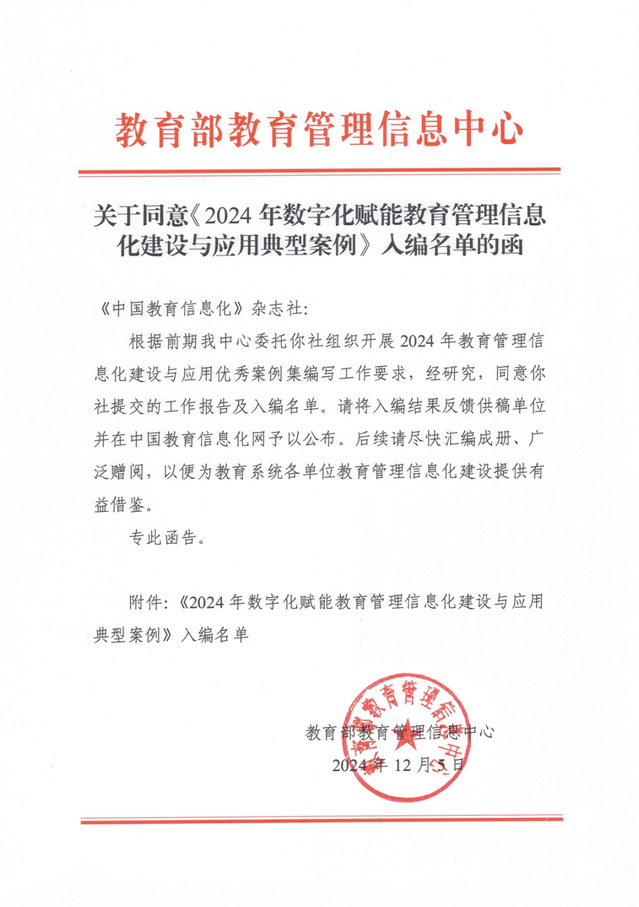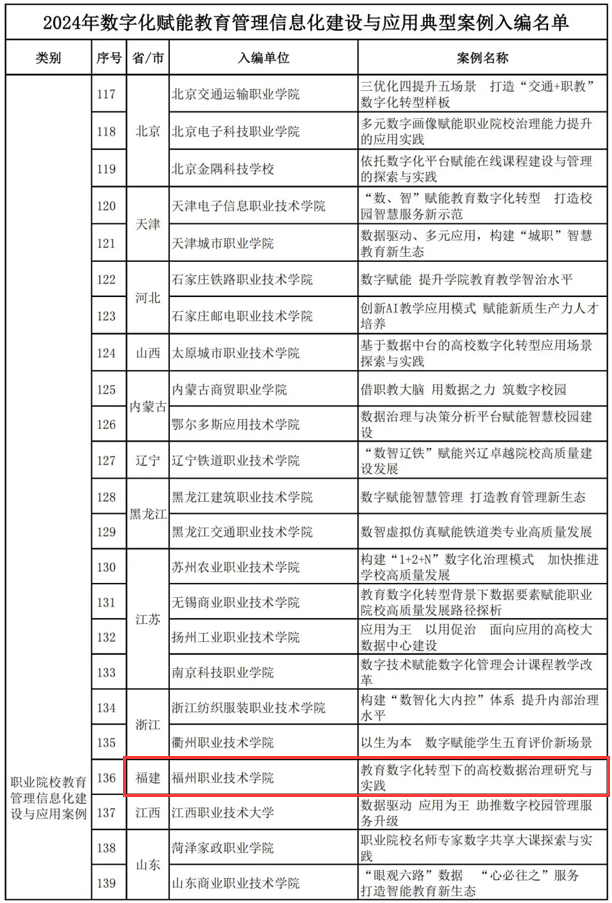 近日,教育部教育管理信息中心公布了《2024年数字化赋能教育管理信息化建设与应用典型案例》入编名单,我校《教育数字化转型下的高校数据治理研究与实践》案例成功入选,是福建省唯一入编的高职院校案例。