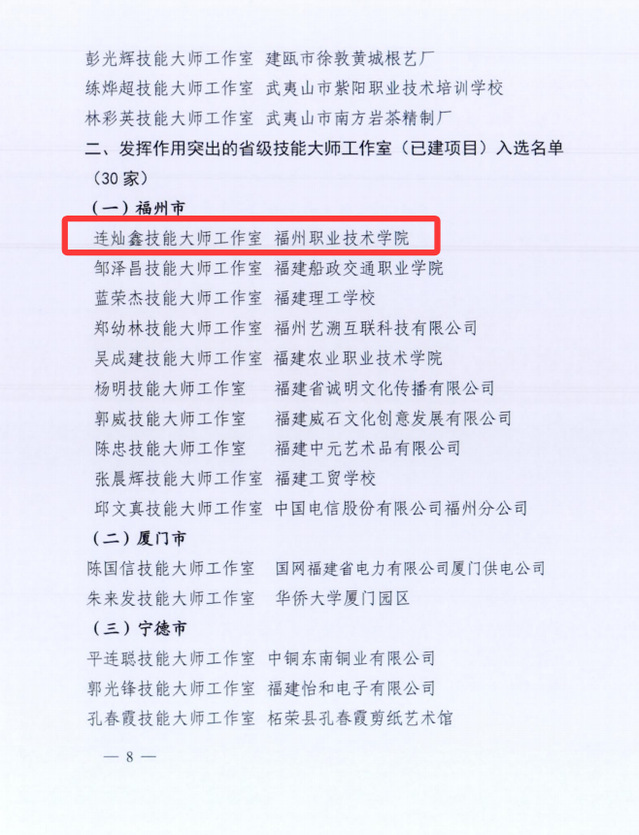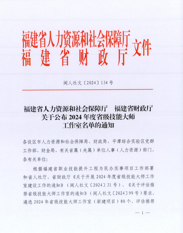 近日,福建省人力资源和社会保障厅、福建省财政厅公布了2024年度省级技能大师工作室名单。