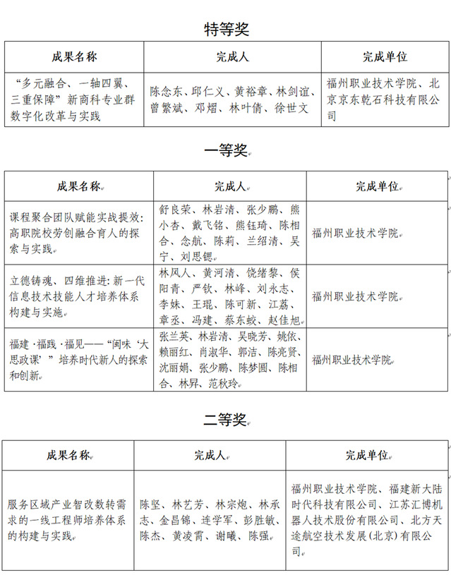 日前,福建省教育厅公布了2024年省级教学成果奖获奖成果,由我校主持的5项成果奖获职业教育省级教学成果奖,其中特等奖1项、一等奖3项、二等奖1项。