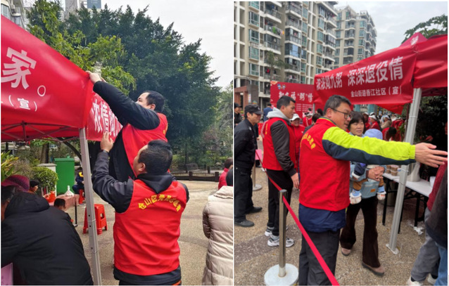 活动当天,身着红马甲的党员志愿者们早早忙碌起来。他们精心准备食材,将糯米、红枣、花生、桂圆等一一洗净、下锅,经过数小时的耐心熬煮,一锅锅香气四溢的拗九粥新鲜出炉。志愿者们穿梭在人群中,为现场的市民和台湾同胞递上热气腾腾的拗九粥,送上节日的温暖祝福。为了让台湾同胞更深入体验福州传统文化,居民和台胞们共同表演歌舞文艺活动,促进两地同胞的感情交流。