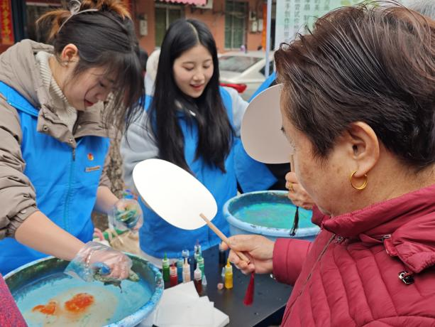 艺术类专业的学生志愿者们结合学院专业特色,带领老人们体验非遗传统漆扇制作。通过调漆、点染、成扇等环节,一幅幅色彩斑斓的漆扇作品在老人手中诞生。活动不仅让老人们感受到传统工艺的魅力,更以艺术为纽带传递了年轻一代对长者的敬意。