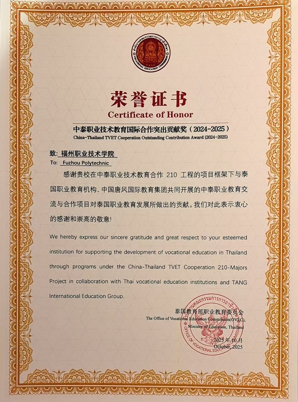 我校荣获“中泰职业技术教育国际合作突出贡献奖(2024-2025)”