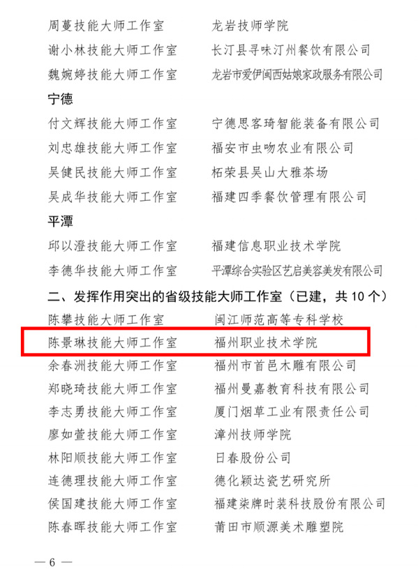 全省共遴选出“省级技能大师工作室(新建项目)”60个,评估推荐“发挥作用突出的省级技能大师工作室(已建项目)”10个。其中,我校陈景琳技能大师工作室入选“发挥作用突出的省级技能大师工作室”。