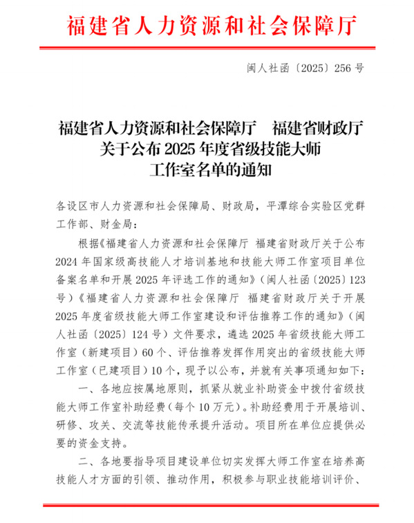 近日,福建省人力资源和社会保障厅、福建省财政厅公布了2025年度省级技能大师工作室名单。